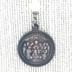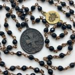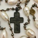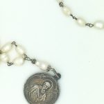 19th century French Sacred Heart of Jesus icon, featuring the Sacred Heart of Jesus with French text meaning Adoration of the Sacred Heart of Jesus and Sacred Heart of Jesus icon with French text meaning Action of Grace Repair Supplication on the other. Presented on a trinity inspired rosary hand crafted solid bronze chain with genuine faceted ruby beads and genuine freshwater pearls.